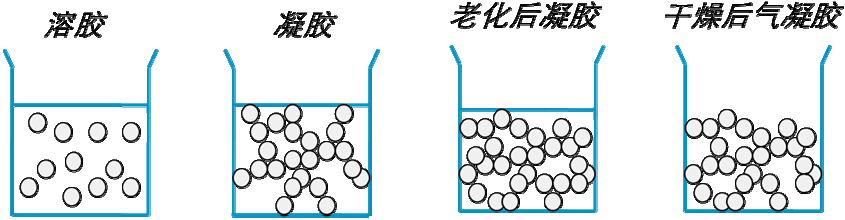 首先,前體溶液在催化劑的作用下形成膠體粒子分散在溶劑中,即所謂溶膠。溶膠中的膠體粒子經(jīng)聚集縮合的凝膠過(guò)程形成無(wú)序交聯(lián)的具有空間三維網(wǎng)絡(luò)結(jié)構(gòu)的濕凝膠;由于剛形成的濕凝膠,其三維結(jié)構(gòu)強(qiáng)度不足,很容易破碎斷裂,因此需要在母體溶液中老化一段時(shí)間。老化過(guò)程中,凝膠內(nèi)部和表面尚未反應(yīng)的官能團(tuán)會(huì)進(jìn)一步縮合,使得所制備的凝膠的強(qiáng)度提高;老化后的凝膠,再通過(guò)特定的干燥過(guò)程,保證其結(jié)構(gòu)不被破壞的條件下,去除其納米量級(jí)孔結(jié)構(gòu)中的大量溶劑,得到高孔隙率、低密度的多孔固體材料——?dú)饽z。